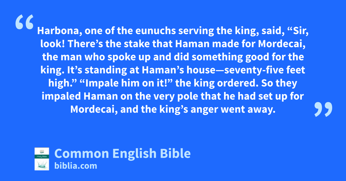 Harbona, one of the eunuchs serving the king, said, “Sir, look! There’s the stake that Haman made for Mordecai, the man who spoke up and did something good for the king. It’s standing at Haman’s house—seventy-five feet high.” “Impale him on it!” the king ordered. So they impaled Haman on the very pole that he had set up for Mordecai, and the king’s anger went away.