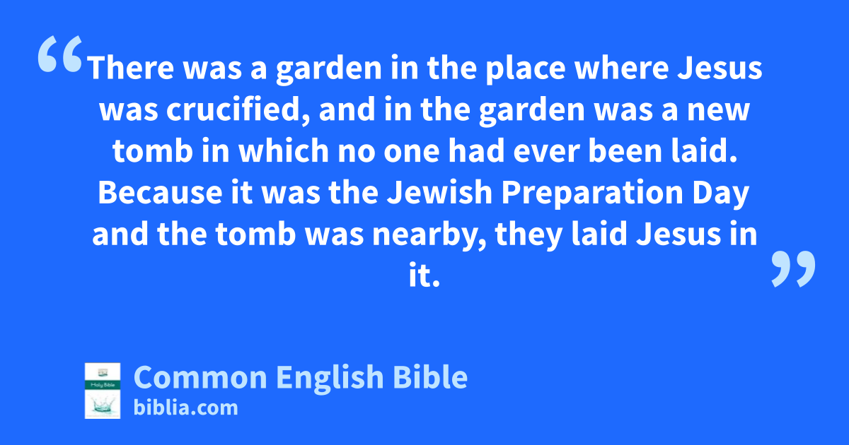 There was a garden in the place where Jesus was crucified, and in the garden was a new tomb in which no one had ever been laid. Because it was the Jewish Preparation Day and the tomb was nearby, they laid Jesus in it.