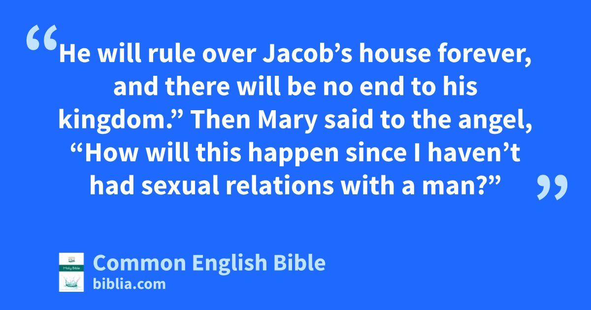 He will rule over Jacob’s house forever, and there will be no end to his kingdom.” Then Mary said to the angel, “How will this happen since I haven’t had sexual relations with a man?”