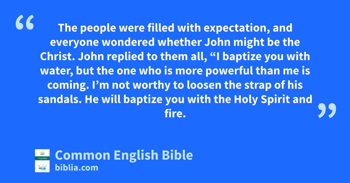 The people were filled with expectation, and everyone wondered whether John might be the Christ. John replied to them all, “I baptize you with water, but the one who is more powerful than me is coming. I’m not worthy to loosen the strap of his sandals. He will baptize you with the Holy Spirit and fire.
