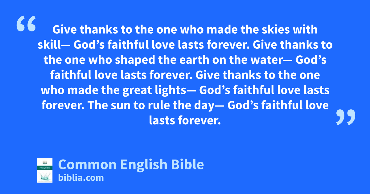 Give thanks to the one who made the skies with skill— God’s faithful love lasts forever. Give thanks to the one who shaped the earth on the water— God’s faithful love lasts forever. Give thanks to the one who made the great lights— God’s faithful love lasts forever. The sun to rule the day— God’s faithful love lasts forever.