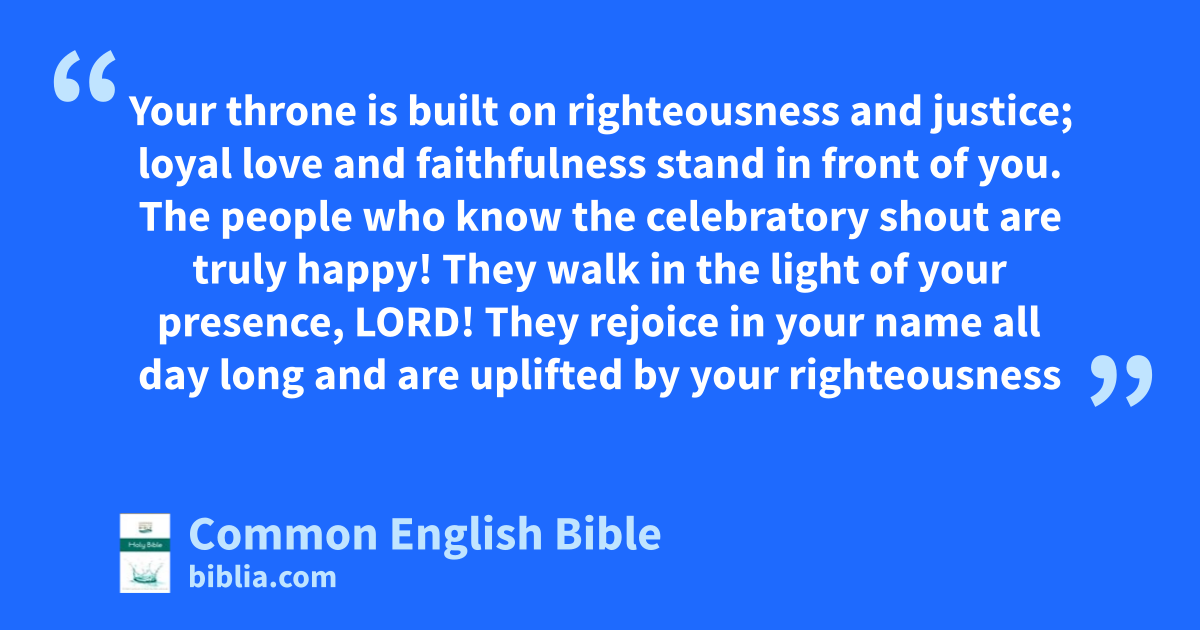 Your throne is built on righteousness and justice; loyal love and faithfulness stand in front of you. The people who know the celebratory shout are truly happy! They walk in the light of your presence, LORD! They rejoice in your name all day long and are uplifted by your righteousness
