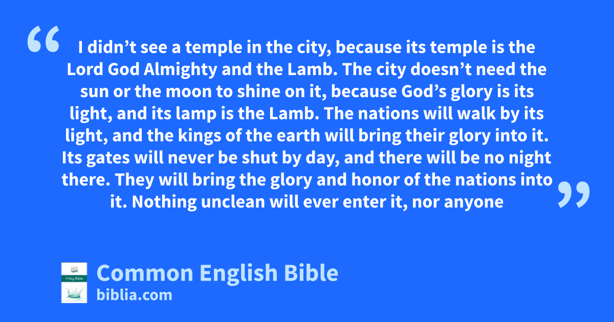 I didn’t see a temple in the city, because its temple is the Lord God Almighty and the Lamb. The city doesn’t need the sun or the moon to shine on it, because God’s glory is its light, and its lamp is the Lamb. The nations will walk by its light, and the kings of the earth will bring their glory into it. Its gates will never be shut by day, and there will be no night there. They will bring the glory and honor of the nations into it. Nothing unclean will ever enter it, nor anyone