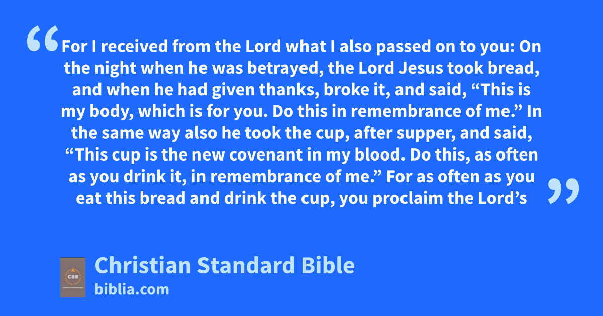 23 For I received from the Lord what I also passed on to you:t On the night when he was betrayed, the Lord Jesus took bread, 24 and when he had given thanks, broke it, and said,D “This is my body, which isE for you. Do this in remembrance of me.”u