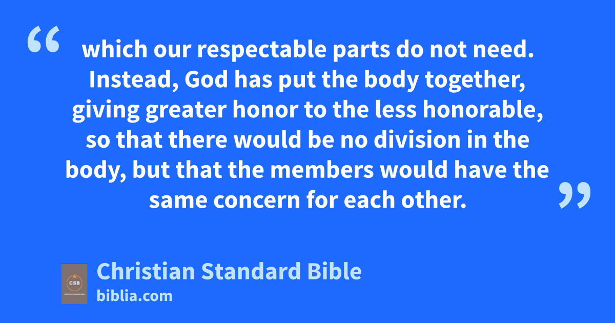 Instead, God has put the body together, giving greater honor to the less honorable, 25 so that there would be no divisionp in the body, but that the members would have the same concern for each other. 26 So if one member suffers, all the members suffer with it; if one member is honored, all the members rejoice with it.