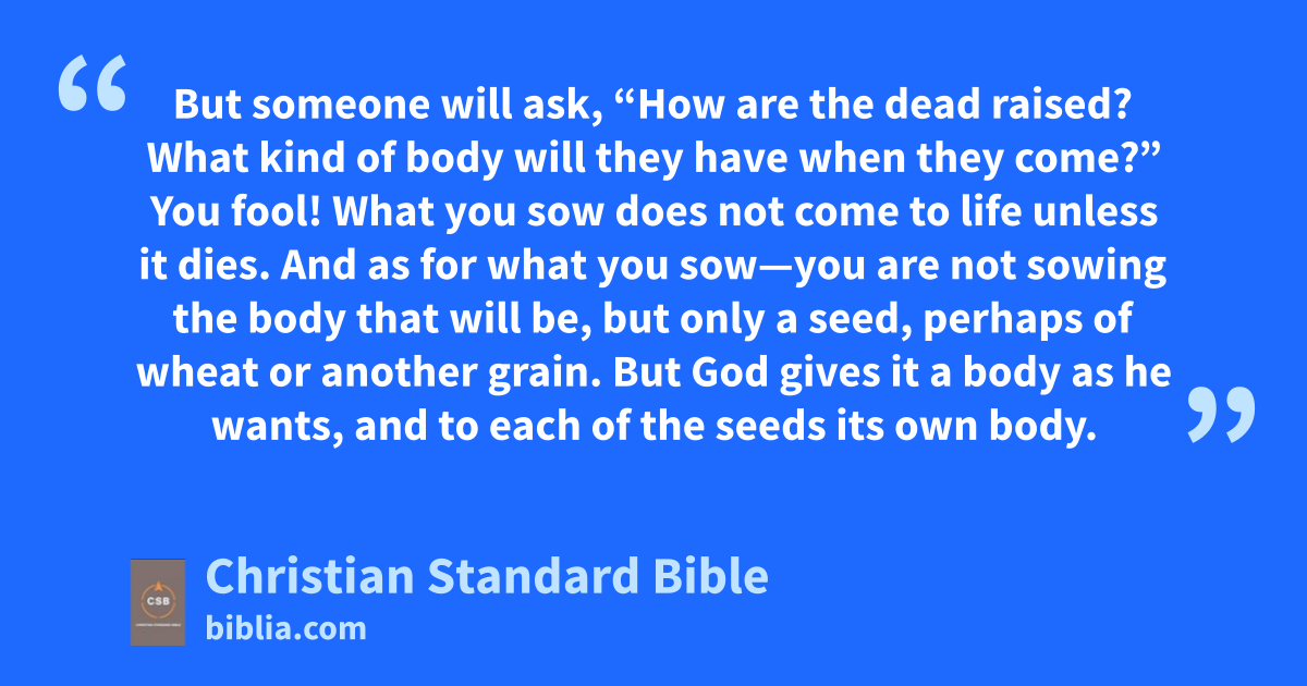 35 But someone will ask, “How are the dead raised? What kind of body will they have when they come?” 36 You fool! What you sow does not come to lifea unless it dies. 37 And as for what you sow—you are not sowing the body that will be, but only a seed, perhaps of wheat or another grain. 38 But God gives it a body as he wants,b and to each of the seeds its own body. 39 Not all fleshc is the same flesh; there is one flesh for humans, another for animals, another for birds, and another for fish. 40 There are heavenly bodies and earthly bodies, but the splendord of the heavenly bodies is different from that of the earthly ones. 41 There is a splendor of the sun, another of the moon, and another of the stars; in fact, one star differs from another star in splendor. 42 So it is with the resurrection of the dead: Sown in corruption, raised in incorruption;e 43 sown in dishonor,f raised in glory;g sown in weakness, raised in power;h 44 sown a natural body, raised a spiritual body. If there is a natural body, there is also a spiritual body. 45 So it is written, The first man Adam became a living being;F,i the last Adamj became a life-giving spirit. 46 However, the spiritual is not first, but the natural, then the spiritual.