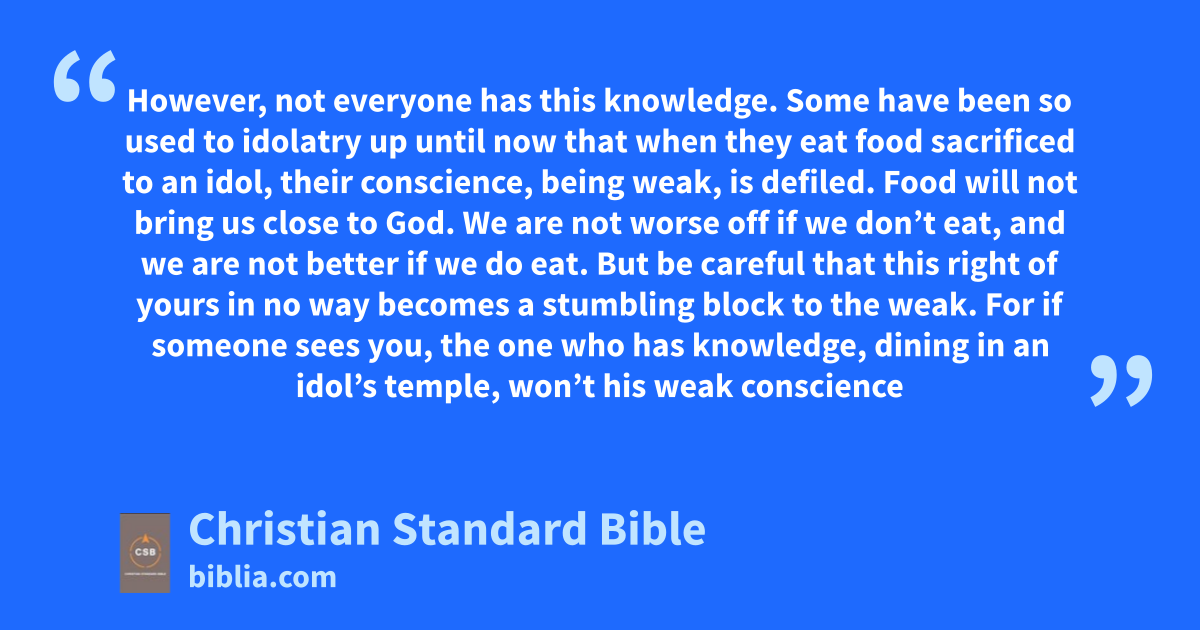 7 However, not everyone has this knowledge. Some have been so used to idolatry up until now that when they eat food sacrificed to an idol, their conscience, being weak, is defiled. 8 Food will not bring us close to God.D We are not worse off if we don’t eat, and we are not better if we do eat.l 9 But be careful that this right of yours in no way becomes a stumbling blockm to the weak. 10 For if someone sees you, the one who has knowledge, dining in an idol’s temple, won’t his weak conscience be encouragedE to eat food offered to idols? 11 So the weak person, the brother or sister for whom Christ died,n is ruinedA,o by your knowledge.p 12 Now when you sin like this against brothers and sisters and wound their weak conscience, you are sinning against Christ. 13 Therefore, if food causes my brother or sister to fall, I will never again eat meat,q so that I won’t cause my brother or sister to fall.