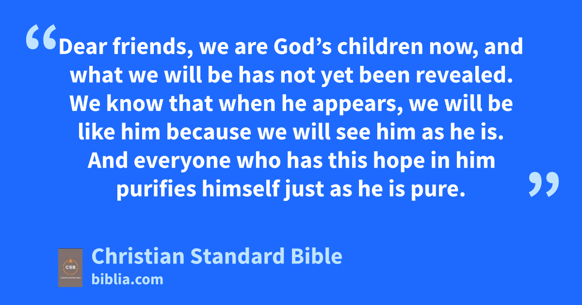 28 So now, little children, remain in him so that when he appearsp we may have confidence and not be ashamed before him at his coming.q 29 If you know that he is righteous, you know this as well: Everyone who does what is right has been born of him.r s 3 See what great loveA the Father has given us that we should be called God’s children—and we are! The reason the world does not know us is that it didn’t know him. 2 Dear friends, we are God’s children now, and what we will be has not yet been revealed.t We know that when he appears,B we will be like himu because we will see him as he is.v 3 And everyone who has this hopew in him purifies himself just as he is pure.x