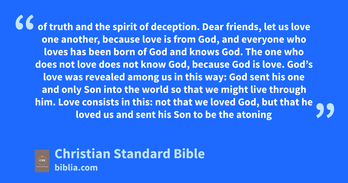 7 Dear friends, let us love one another, because love is from God, and everyone who loves has been born of Godq and knows God. 8 The one who does not love does not know God, because God is love. 9 God’s love was revealed among usB in this way: God sentr his one and only Sons into the world so that we might livet through him. 10 Love consists in this: not that we loved God, but that he loved usu and sent his Son to be the atoning sacrificeC,v for our sins. 11 Dear friends, if God loved us in this way, we also must love one another.w 12 No one has ever seen God.x If we love one another, God remains inD us and his love is made complete in us. 13 This is how we know that we remain in himy and he in us: He has given us of his Spirit.z 14 And we have seen and we testify that the Father has sent his Sonaa as the world’s Savior. 15 Whoever confessesab that Jesus is the Son of God—God remains in him and he in God. 16 And we have come to know and to believe the love that God has for us.
