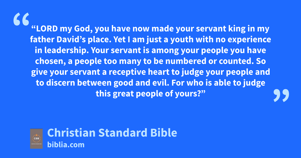 7 “Lord my God, you have now made your servant king in my father David’s place.aj Yet I am just a youth with no experience in leadership.C,a 8 Your servant is among your people you have chosen,b a people too many to be numbered or counted.c 9 So give your servant a receptive heart to judged your people and to discern between good and evil. For who is able to judge this great people of yours?”e