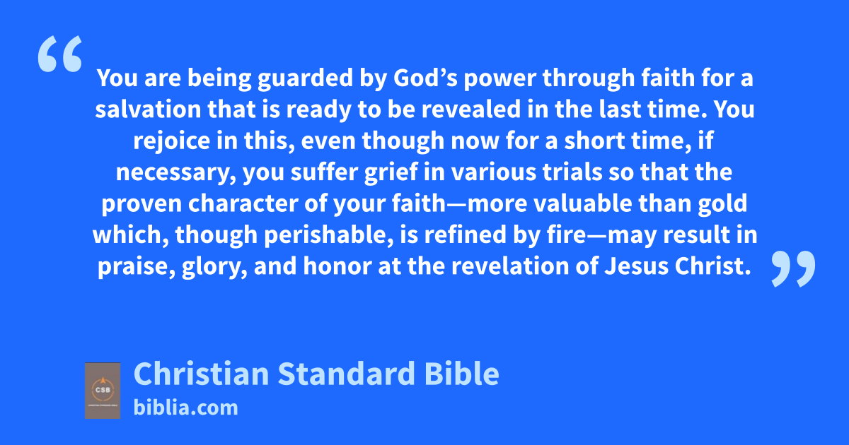 3 Blessed be the God and Father of our Lord Jesus Christ.j Because of his great mercyk he has given us new birthl into a living hopem through the resurrection of Jesus Christ from the deadn 4 and into an inheritance that is imperishable,o undefiled, and unfading, kept in heavenp for you. 5 You are being guarded by God’s powerq through faith for a salvation that is ready to be revealed in the last time.r 6 You rejoice in this,A even though now for a short time, if necessary, you suffer grief in various trialss 7 so that the proven character of your faitht—more valuable than gold which, though perishable, is refined by fireu—may resultv in praise, glory, and honorw at the revelation of Jesus Christ.x 8 Though you have not seeny him, you love him;z though not seeing him now, you believe in him, and you rejoiceaa with inexpressible and glorious joy, 9 because you are receiving the goal of your faith, the salvation of your souls.