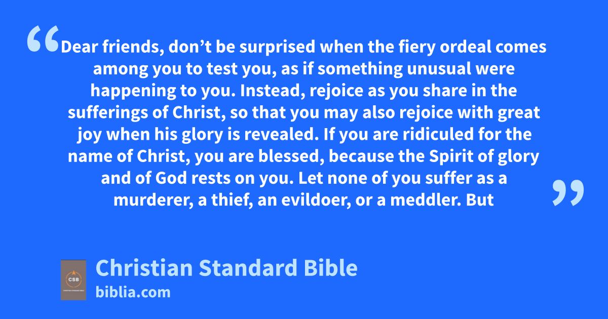12 Dear friends, don’t be surprised when the fiery ordeal comes among you to test you, as if something unusual were happening to you.a 13 Instead, rejoice as you share in the sufferings of Christ,b so that you may also rejoice with great joy when his glory is revealed.c 14 If you are ridiculed for the name of Christ,d you are blessed, because the Spirite of glory and of GodD rests on you. 15 Let none of you suffer as a murderer, a thief, an evildoer, or a meddler.E 16 But if anyone suffers as a Christian, let him not be ashamed but let him glorify God in having that name.F 17 For the time has come for judgmentf to begin with God’s household,g and if it begins with us, what will the outcome be for those who disobey the gospel of God?