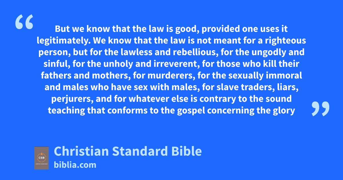 3 As I urged you when I went to Macedonia,f remain in Ephesusg so that you may instruct certain peopleh not to teach false doctrine 4 or to pay attention to mythsi and endless genealogies. These promote empty speculations rather than God’s plan,j which operates by faith. 5 Now the goal of our instruction is lovek that comes from a pure heart,l a good conscience,m and a sincere faith.n 6 Some have departed from these and turned aside to fruitless discussion. 7 They want to be teachers of the law, although they don’t understand what they are saying or what they are insisting on. 8 But we know that the law is good,o provided one uses it legitimately. 9 We know that the law is not meant for a righteous person, but for the lawless and rebellious,p for the ungodly and sinful, for the unholy and irreverent, for those who kill their fathers and mothers, for murderers, 10 for the sexually immoralq and males who have sex with males,r for slave traders, liars,s perjurers, and for whatever else is contrary to the sound teachingt 11 that conforms to the gospelu concerning the glory of the blessed God,v which was entrusted to me.w