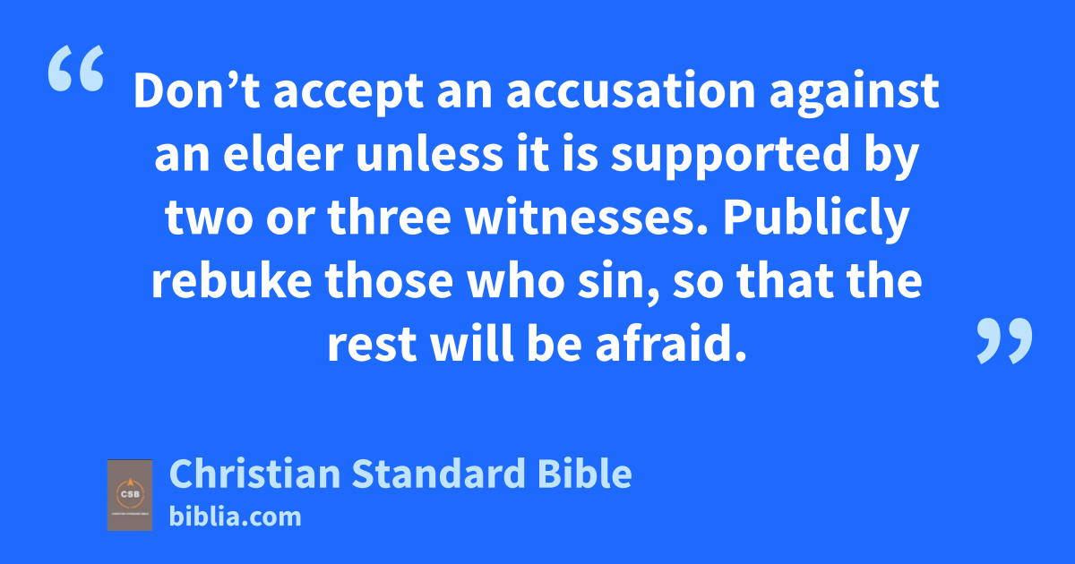 19 Don’t accept an accusation against an elder unless it is supported by two or three witnesses.x 20 Publicly rebuke those who sin, so that the rest will be afraid. 21 I solemnly charge you before God and Christ Jesus and the elect angels to observey these things without prejudice, doing nothing out of favoritism. 22 Don’t be too quick to appointD,z anyone as an elder, and don’t share in the sins of others. Keep yourself pure.aa 23 Don’t continue drinking only water, but use a little wine because of your stomach and your frequent illnesses. 24 Some people’s sins are obvious, preceding them to judgment,ab but the sins of others surfaceE later. 25 Likewise, good works are obvious, and those that are not obvious cannot remain hidden.
