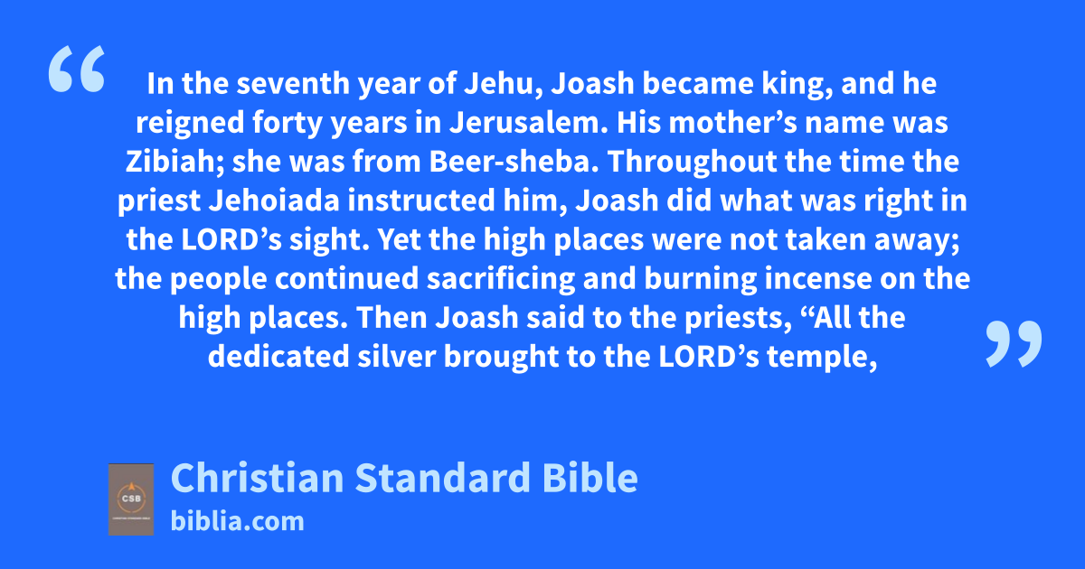 21 JoashB,y was seven years old when he became king.z 12 In the seventh year of Jehu, Joash became king, and he reigned forty years in Jerusalem. His mother’s name was Zibiah; she was from Beer-sheba.aa 2 Throughout the time the priest Jehoiadaab instructedac him, Joash did what was right in the Lord’s sight.ad 3 Yet the high places were not taken away; the people continued sacrificing and burning incense on the high places.ae