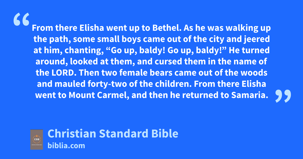 23 From there Elisha went up to Bethel.r As he was walking up the path, some small boys came out of the city and jeered at him,s chanting, “Go up, baldy! Go up, baldy!” 24 He turned around, looked at them, and cursed them in the name of the Lord.t Then two female bears came out of the woods and mauled forty-two of the children. 25 From there Elisha went to Mount Carmel,u and then he returned to Samaria.v