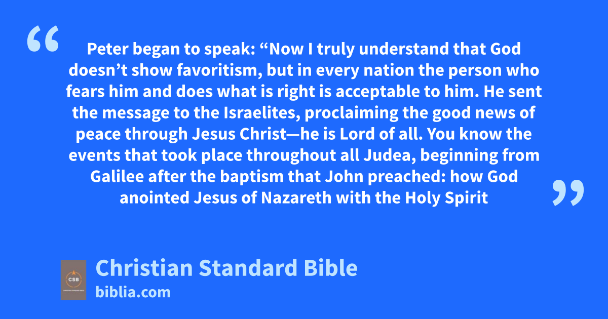 34 Peter began to speak: “Now I truly understand that God doesn’t show favoritism,i 35 but in every nation the person who fears him and does what is right is acceptable to him. 36 He sent the message to the Israelites, proclaiming the good news of peace through Jesus Christ—he is Lord of all.j 37 You know the events that took place throughout all Judea, beginning from Galilee after the baptism that John preached: 38 how God anointed Jesus of Nazareth with the Holy Spirit and with power, and how he went about doing good and healing all who were under the tyranny of the devil, because God was with him.k 39 We ourselves are witnesses of everything he did in both the Judean country and in Jerusalem, and yet they killed him by hanging him on a tree.l 40 God raised up this man on the third day and caused him to be seen, 41 not by all the people, but by us whom God appointed as witnesses, who ate and drank with him after he rose from the dead.m 42 He commanded us to preach to the people and to testify that he is the one appointed by God to be the judge of the living and the dead.n 43 All the prophets testifyo about him that through his namep everyone who believes in him receives forgiveness of sins.”q