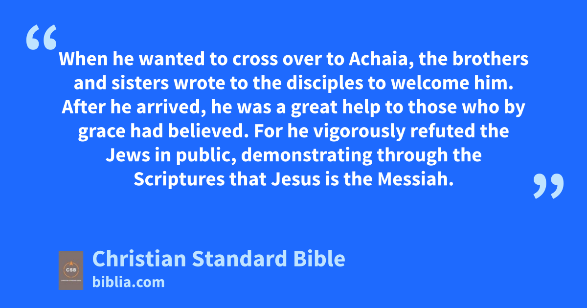 24 Now a Jew named Apollos,i a native Alexandrian, an eloquent man who was competent in the use of the Scriptures, arrived in Ephesus. 25 He had been instructed in the way of the Lord; and being fervent in spirit,A he was speaking and teaching accurately about Jesus, although he knew only John’s baptism.j 26 He began to speak boldly in the synagogue. After Priscilla and Aquila heard him, they took him asideB and explained the way of God to him more accurately.k 27 When he wanted to cross over to Achaia, the brothers and sisters wrote to the disciples to welcome him. After he arrived, he was a great help to those who by grace had believed.l 28 For he vigorously refuted the Jews in public, demonstrating through the Scriptures that Jesus is the Messiah.m