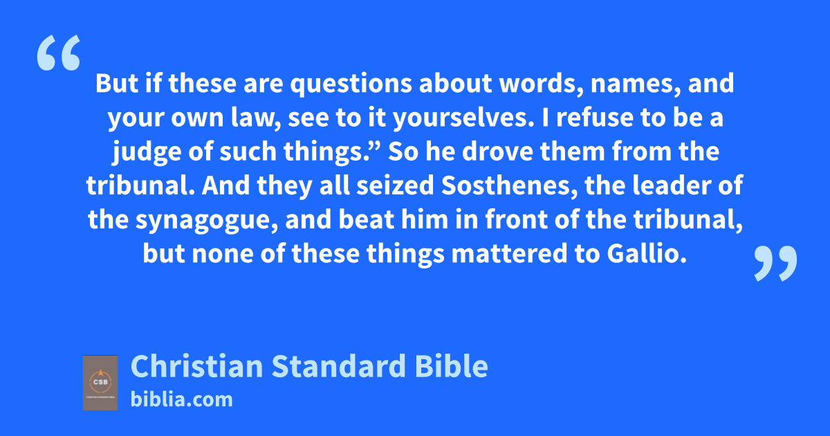 14 As Paul was about to open his mouth, Gallio said to the Jews, “If it were a matter of wrongdoing or of a serious crime, it would be reasonable for me to put up with you Jews. 15 But if these are questions about words, names, and your own law, see to it yourselves. I refuse to be a judge of such things.”b 16 So he drove them from the tribunal. 17 And they allD seized Sosthenes,c the leader of the synagogue, and beat him in front of the tribunal, but none of these things mattered to Gallio.