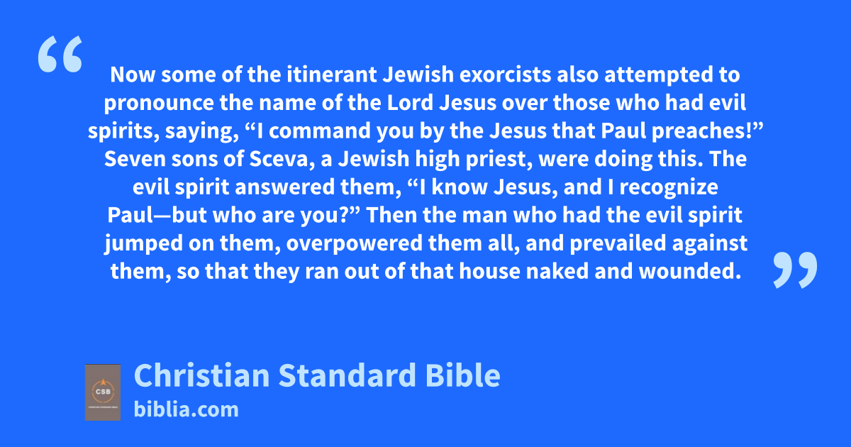 13 Now some of the itinerant Jewish exorcists also attempted to pronounce the name of the Lord Jesus over those who had evil spirits, saying, “I command you by the Jesus that Paul preaches!”aa 14 Seven sons of Sceva, a Jewish high priest, were doing this. 15 The evil spirit answered them, “I know Jesus, and I recognize Paul—but who are you?” 16 Then the man who had the evil spirit jumped on them, overpowered them all, and prevailed against them, so that they ran out of that house naked and wounded. 17 When this became known to everyone who lived in Ephesus, both Jews and Greeks, they became afraid, and the name of the Lord Jesusa was held in high esteem.b