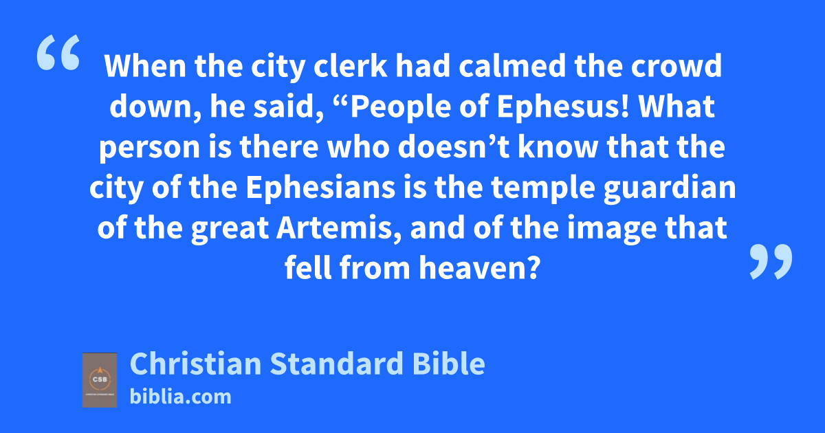35 When the city clerk had calmed the crowd down, he said, “People of Ephesus! What person is there who doesn’t know that the city of the Ephesians is the temple guardian of the greatA Artemis, and of the image that fell from heaven? 36 Therefore, since these things are undeniable, you must keep calm and not do anything rash. 37 For you have brought these men here who are not temple robbers or blasphemers of ourB goddess. 38 So if Demetrius and the craftsmen who are with him have a case against anyone, the courts are in session, and there are proconsuls. Let them bring charges against one another.n 39 But if you seek anything further, it must be decided in a legal assembly. 40 In fact, we run a risk of being charged with riotingo for what happened today, since there is no justification that we can give as a reason for this disturbance.” 41 After saying this, he dismissed the assembly.