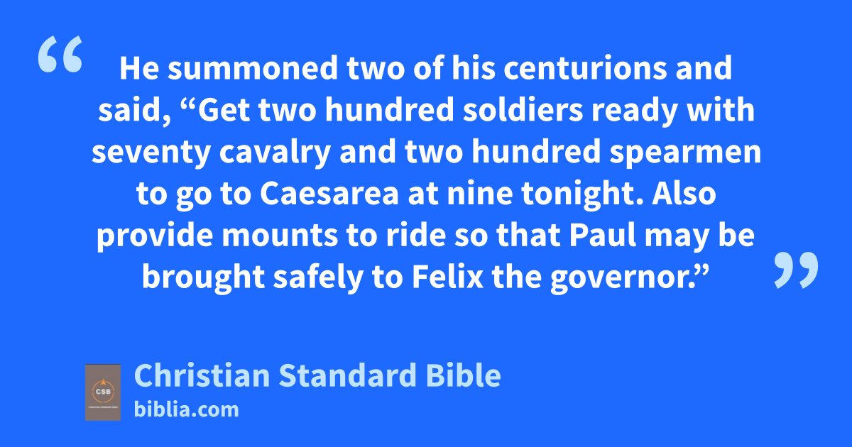 23 He summoned two of his centurions and said, “Get two hundred soldiers ready with seventy cavalry and two hundred spearmen to go to Caesarea at nine tonight.B, a 24 Also provide mounts to ride so that Paul may be brought safely to Felix the governor.”
