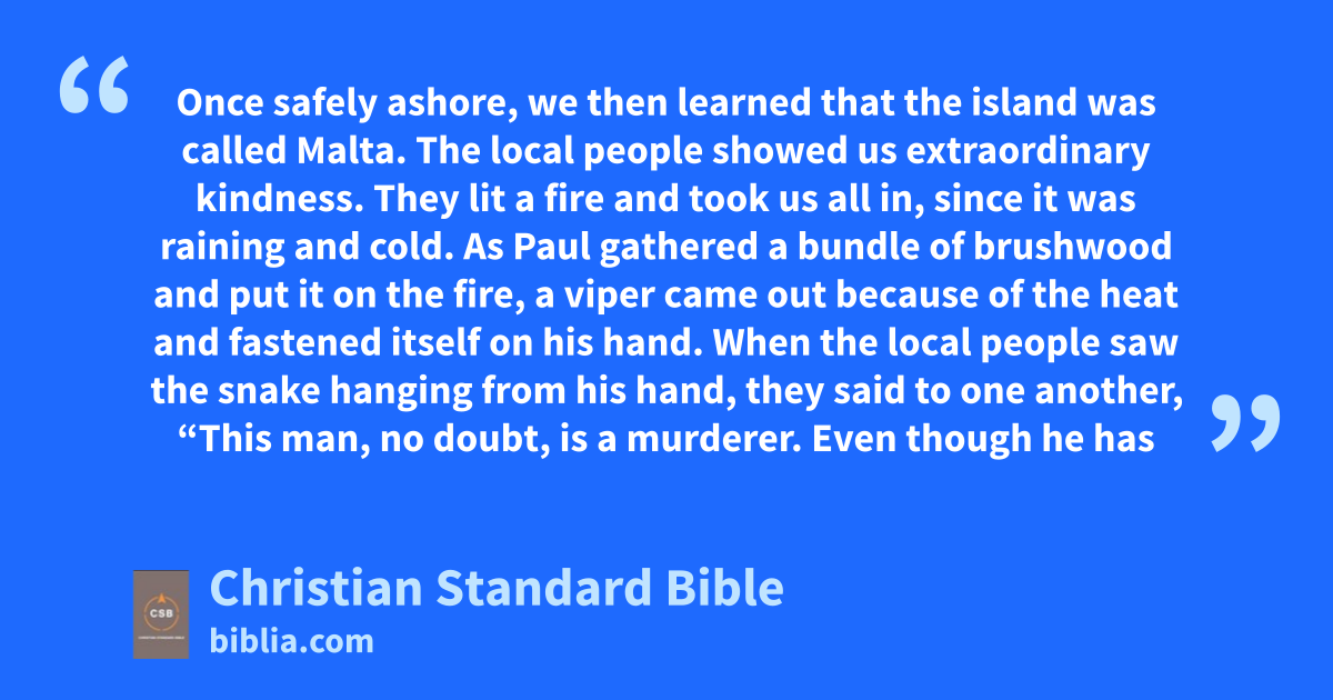 28 Once safely ashore, wef then learned that the island was called Malta.g 2 The local peopleh showed us extraordinary kindness. They lit a fire and took us all in, since it was raining and cold. 3 As Paul gathered a bundle of brushwood and put it on the fire, a viper came out because of the heat and fastened itself on his hand. 4 When the local people saw the snake hanging from his hand, they said to one another, “This man, no doubt, is a murderer. Even though he has escaped the sea, Justice has not allowed him to live.”i 5 But he shook the snake off into the fire and suffered no harm.j 6 They expected that he would begin to swell up or suddenly drop dead. After they waited a long time and saw nothing unusual happen to him, they changed their minds and said he was a god.k