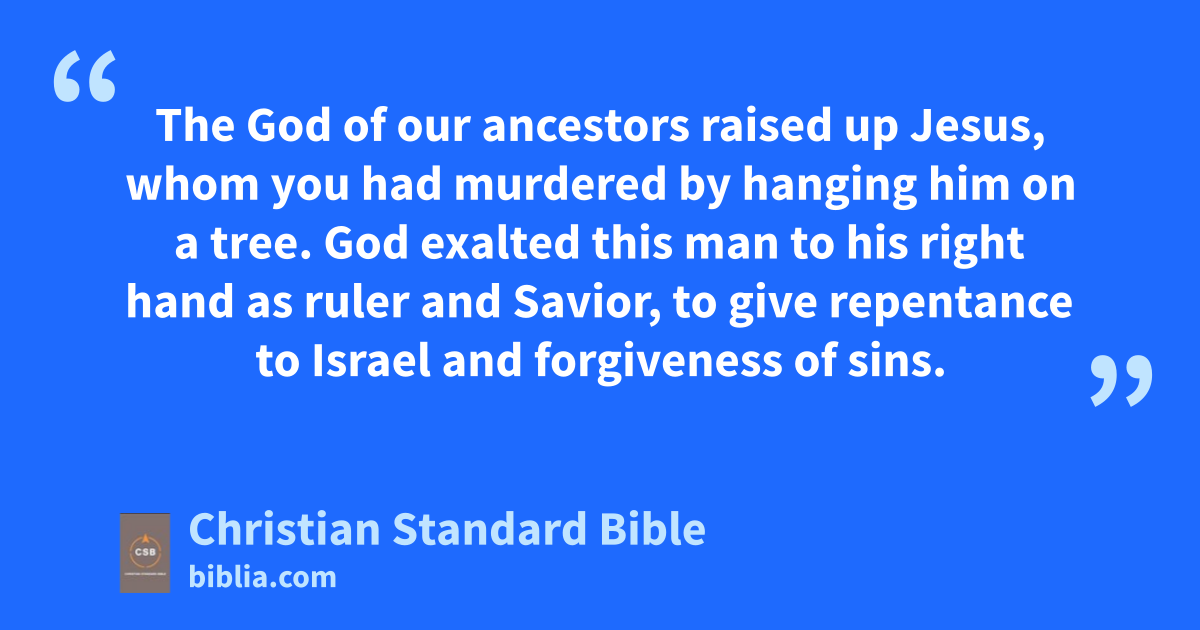 29 Peter and the apostles replied, “We must obey God rather than people. 30 The God of our ancestors raised up Jesus,e whom you had murdered by hanging him on a tree.f 31 God exalted this man to his right hand as ruler and Savior, to give repentance to Israel and forgiveness of sins.g 32 We are witnesses of these things, and so is the Holy Spirith whom God has given to those who obey him.”