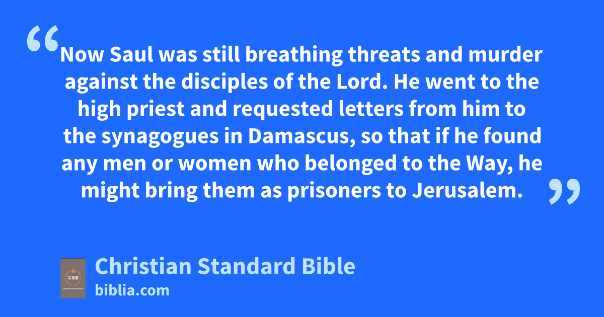 9 Now Saul was still breathing threats and murder against the disciplesd of the Lord. He went to the high prieste 2 and requested lettersf from him to the synagogues in Damascus, so that if he found any men or women who belonged to the Way,g he might bring them as prisoners to Jerusalem. 3 Ash he traveled and was nearing Damascus, a light from heaven suddenly flashed around him. 4 Falling to the ground, he heard a voice saying to him, “Saul, Saul, why are you persecuting me?”