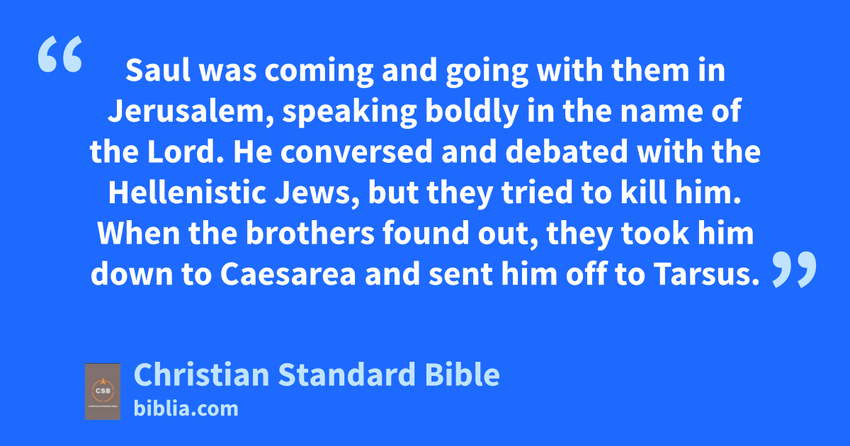 26 When he arrived in Jerusalem,y he tried to join the disciples, but they were all afraid of him, since they did not believe he was a disciple. 27 Barnabas, however, took him and brought him to the apostles and explained to them how Saul had seen the Lord on the road and that the Lord had talked to him, and how in Damascus he had spoken boldlya in the name of Jesus.b 28 Saul was coming and going with them in Jerusalem, speaking boldly in the name of the Lord. 29 He conversed and debated with the Hellenistic Jews, but they tried to kill him.c 30 When the brothers found out, they took him down to Caesarea and sent him off to Tarsus.d
