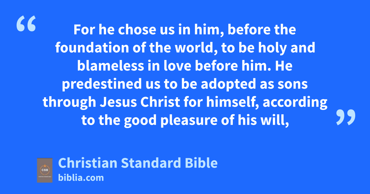 3 Blessed is the God and Father of our Lord Jesus Christ, who has blessed us with every spiritual blessing in the heavens in Christ.f 4 For he chose us in him, before the foundation of the world, to be holy and blameless in love before him.C,f 5 He predestined us to be adopted as sons through Jesus Christ for himself, according to the good pleasure of his will, 6 to the praise of his glorious graceg that he lavished on us in the Beloved One.h