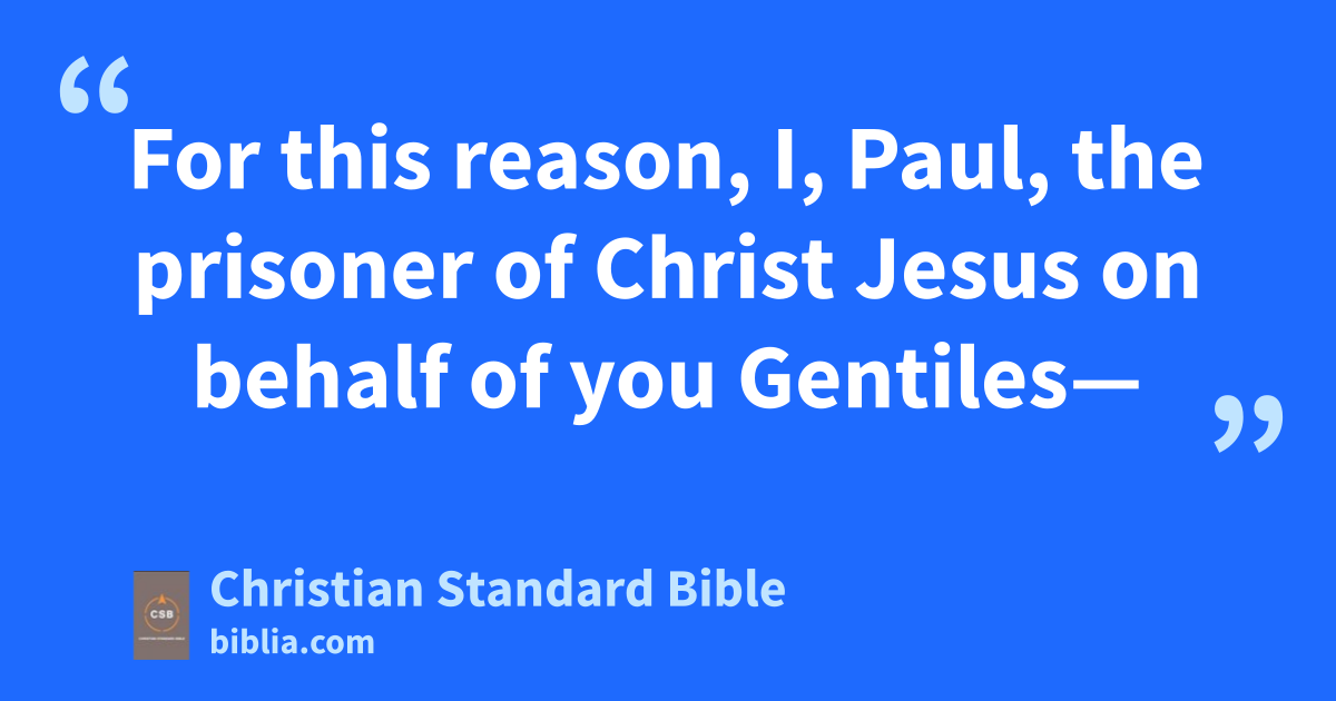 3 For this reason, I, Paul, the prisonerw of Christ Jesus on behalf of you Gentiles—2 assuming you have heard about the administration of God’s grace that he gave me for you. 3 The mystery was made known to me by revelation,x as I have briefly written above. 4 By reading this you are able to understand my insight into the mystery of Christ.y 5 This was not made known to peopleA in other generations as it is now revealed to his holy apostles and prophetsz by the Spirit: 6 The Gentiles are coheirs, members of the same body, and partners in the promiseaa in Christ Jesus through the gospel. 7 I was made a servant of this gospel by the gift of God’s grace that was given to me by the working of his power.ab
