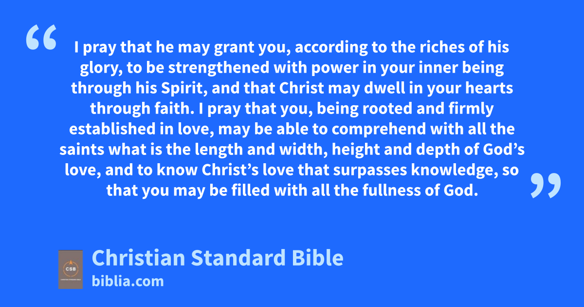 14 For this reason I kneelak before the FatherC 15 from whom every family in heaven and on earth is named. 16 I pray that he may grant you, according to the richesal of his glory,am to be strengthened with poweran in your inner beingao through his Spirit, 17 and that Christ may dwell in your hearts through faith. I pray that you, being rooted and firmly established in love, 18 may be able to comprehend with all the saints what is the length and width, height and depth of God’s love,ap 19 and to know Christ’s love that surpasses knowledge, so that you may be filled with all the fullness of God.