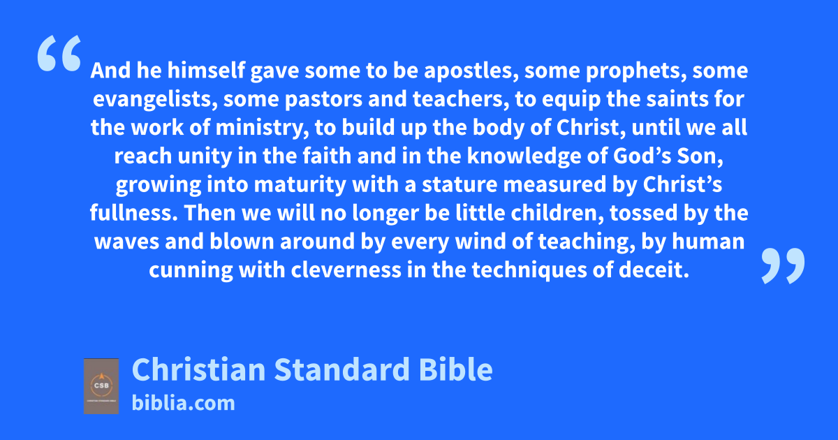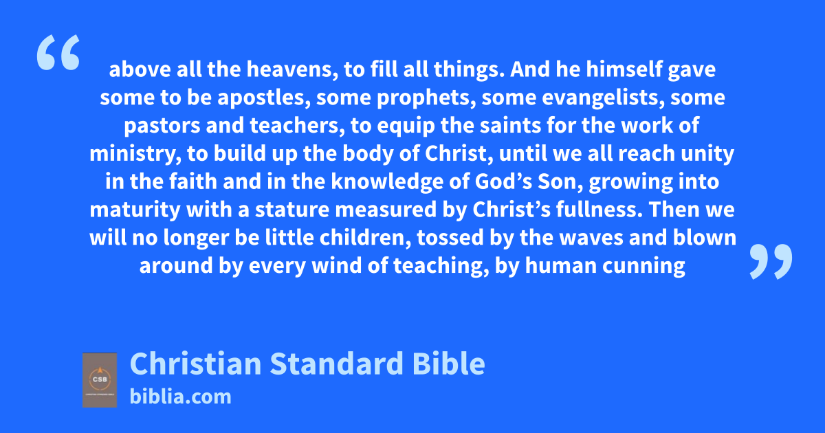 9 But what does “he ascended” mean except that heA also descended to the lower parts of the earth?B,j 10 The one who descended is also the one who ascended far above all the heavens,k to fill all things.l 11 And he himself gave some to be apostles, some prophets, some evangelists, some pastors and teachers, 12 to equip the saints for the work of ministry, to build up the body of Christ,m 13 until we all reach unity in the faith and in the knowledge of God’s Son,n growing into maturity with a statureo measured by Christ’s fullness. 14 Then we will no longer be little children, tossed by the waves and blown around by every wind of teaching,p by human cunning with cleverness in the techniques of deceit. 15 But speaking the truth in love, let us grow in every way into him who is the headq—Christ. 16 From him the whole body, fitted and knit togetherr by every supporting ligament, promotes the growths of the body for building itself up in love by the proper working of each individual part.