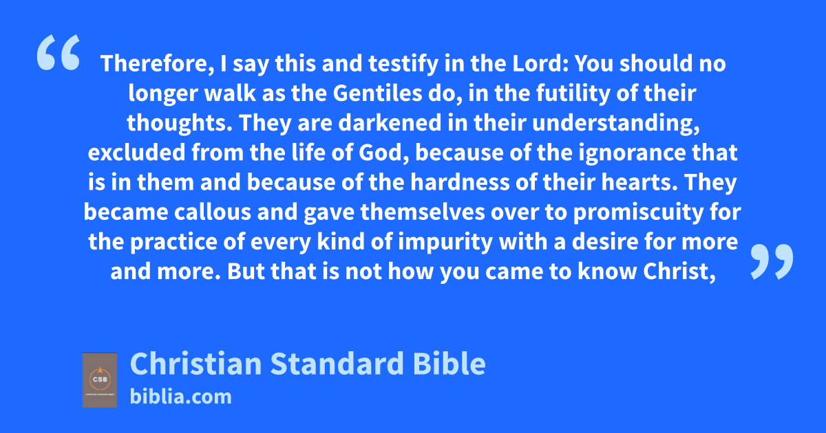 17 Therefore, I say this and testify in the Lord: You should no longer walk as the Gentiles do, in the futility of their thoughts. 18 They are darkened in their understanding, excluded from the life of God, because of the ignorance that is in them and becauseC of the hardness of their hearts. 19 They became callous and gave themselves over to promiscuity for the practice of every kind of impurityt with a desire for more and more.D