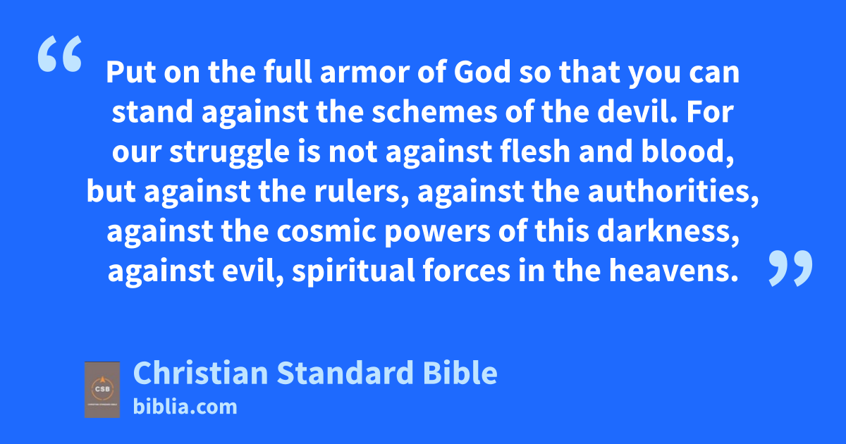 10 Finally, be strengthened by the Lord and by his vast strength.ak 11 Put onal the full armoram of God so that you can stand against the schemes of the devil. 12 For our struggle is not against fleshan and blood, but against the rulers, against the authorities,ao against the cosmic powers of this darkness, against evil,ap spiritual forces in the heavens.aq 13 For this reason take up the full armorar of God, so that you may be able to resistas in the evil day, and having prepared everything, to take your stand. 14 Stand,at therefore, with truthau like a belt around your waist, righteousnessav like armor on your chest,aw 15 and your feet sandaled with readiness for the gospel of peace. 16 In every situation take up the shieldax of faithay with which you can extinguish all the flaming arrows of the evil one.az 17 Take the helmetba of salvation and the swordbb of the Spiritbc—which is the word of God. 18 Praybd at all times in the Spiritbe with every prayer and request, and stay alertbf with all perseverance and intercession for all the saints. 19 Pray also for me, that the message may be given to me when I open my mouth to make known with boldnessbg the mystery of the gospel. 20 For this I am an ambassadora in chains. Pray that I might be bold enough to speak about it as I should.