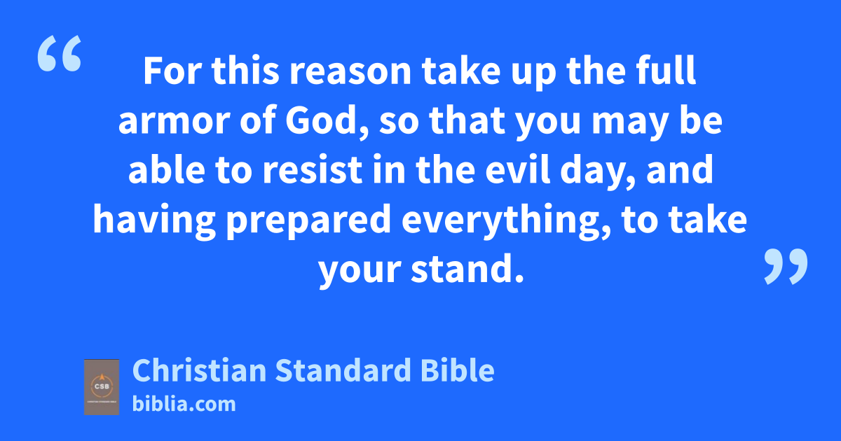 10 Finally, be strengthened by the Lord and by his vast strength.ak 11 Put onal the full armoram of God so that you can stand against the schemes of the devil. 12 For our struggle is not against fleshan and blood, but against the rulers, against the authorities,ao against the cosmic powers of this darkness, against evil,ap spiritual forces in the heavens.aq 13 For this reason take up the full armorar of God, so that you may be able to resistas in the evil day, and having prepared everything, to take your stand. 14 Stand,at therefore, with truthau like a belt around your waist, righteousnessav like armor on your chest,aw 15 and your feet sandaled with readiness for the gospel of peace. 16 In every situation take up the shieldax of faithay with which you can extinguish all the flaming arrows of the evil one.az 17 Take the helmetba of salvation and the swordbb of the Spiritbc—which is the word of God. 18 Praybd at all times in the Spiritbe with every prayer and request, and stay alertbf with all perseverance and intercession for all the saints. 19 Pray also for me, that the message may be given to me when I open my mouth to make known with boldnessbg the mystery of the gospel. 20 For this I am an ambassadora in chains. Pray that I might be bold enough to speak about it as I should.