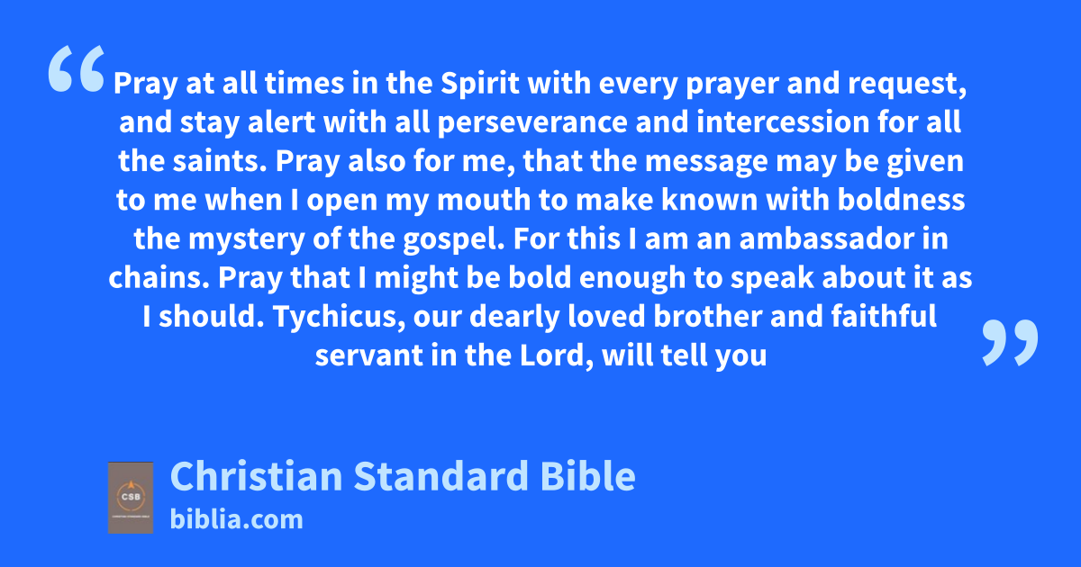 10 Finally, be strengthened by the Lord and by his vast strength.ak 11 Put onal the full armoram of God so that you can stand against the schemes of the devil. 12 For our struggle is not against fleshan and blood, but against the rulers, against the authorities,ao against the cosmic powers of this darkness, against evil,ap spiritual forces in the heavens.aq 13 For this reason take up the full armorar of God, so that you may be able to resistas in the evil day, and having prepared everything, to take your stand. 14 Stand,at therefore, with truthau like a belt around your waist, righteousnessav like armor on your chest,aw 15 and your feet sandaled with readiness for the gospel of peace. 16 In every situation take up the shieldax of faithay with which you can extinguish all the flaming arrows of the evil one.az 17 Take the helmetba of salvation and the swordbb of the Spiritbc—which is the word of God. 18 Praybd at all times in the Spiritbe with every prayer and request, and stay alertbf with all perseverance and intercession for all the saints. 19 Pray also for me, that the message may be given to me when I open my mouth to make known with boldnessbg the mystery of the gospel. 20 For this I am an ambassadora in chains. Pray that I might be bold enough to speak about it as I should.