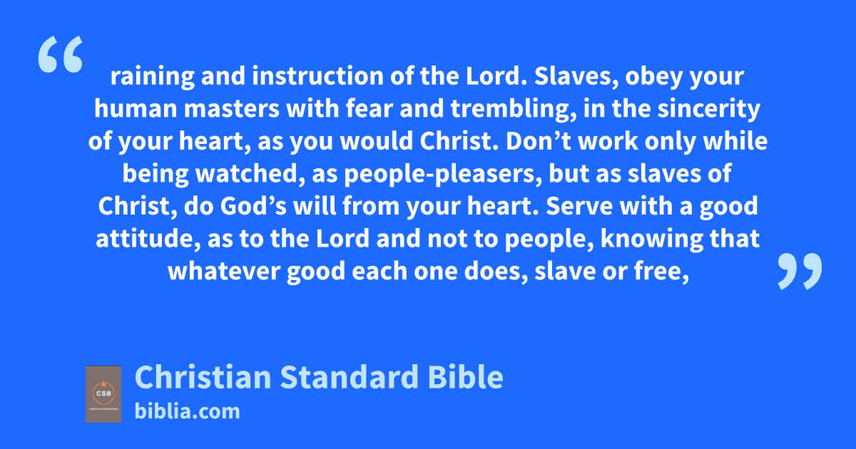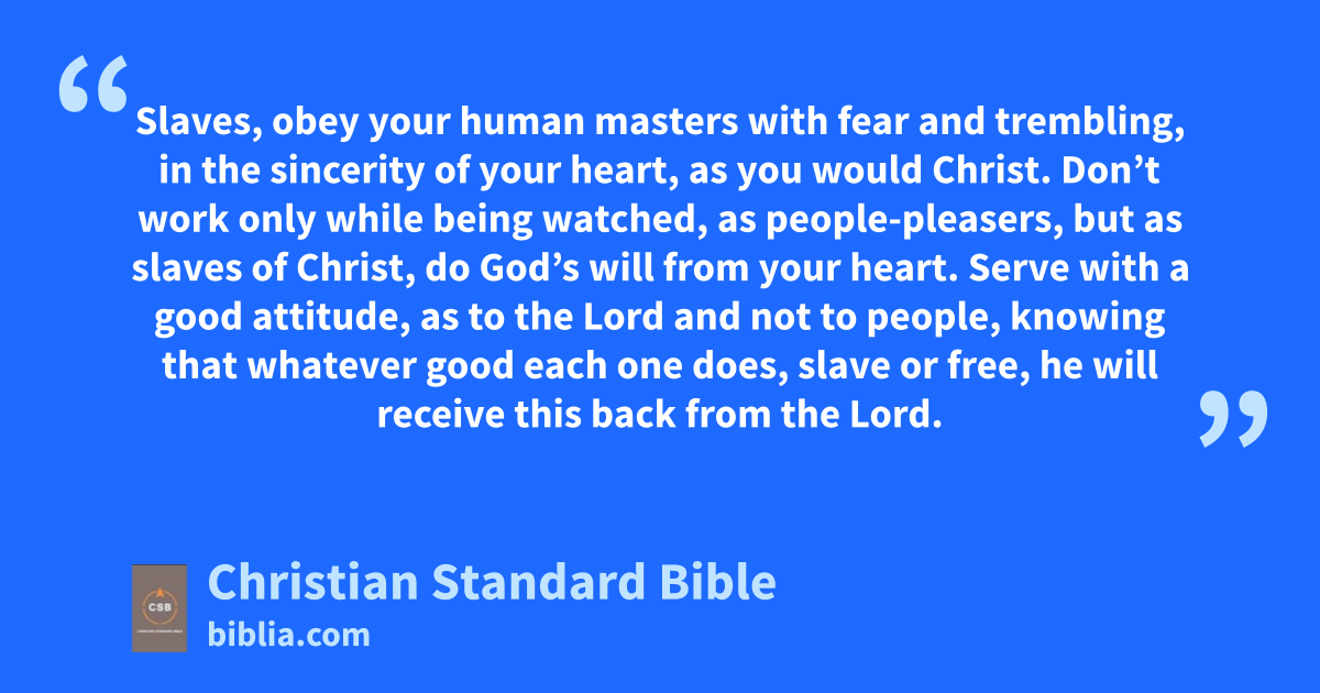 5 Slaves, obey your humanC mastersac with fear and trembling,ad in the sincerityae of your heart, as you would Christ. 6 Don’t work only while being watched, as people-pleasers, but as slaves of Christ, do God’s willaf from your heart. 7 Serve with a good attitude, as to the Lord and not to people,ag 8 knowing that whatever good each one does, slave or free, he will receive this back from the Lord. 9 And masters, treat your slaves the same way, without threateningah them, because you know that both their Master and yours is in heaven, and there is no favoritismai with him.aj
