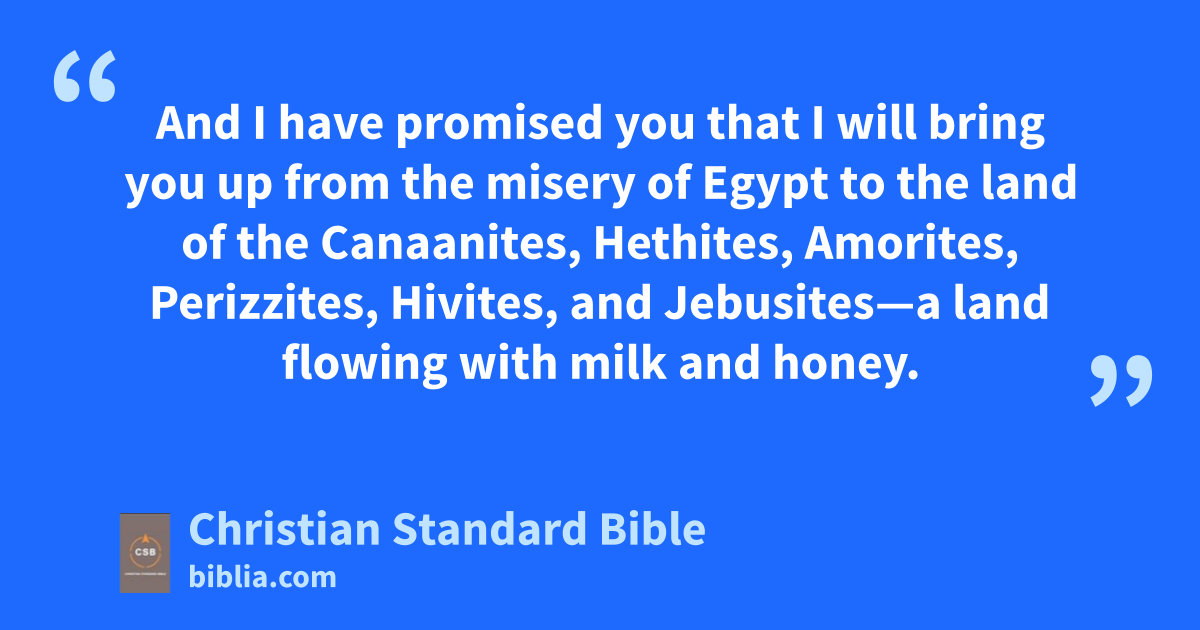 16 “Go and assemble the elders of Israel and say to them: The Lord, the God of your ancestors, the God of Abraham, Isaac, and Jacob, has appeared to me and said: I have paid close attention to you and to what has been done to you in Egypt.w 17 And I have promised you that I will bring you up from the misery of Egypta to the land of the Canaanites, Hethites, Amorites, Perizzites, Hivites, and Jebusites—a land flowing with milk and honey. 18 They will listen to what you say. Then you, along with the elders of Israel, must go to the king of Egypt and say to him: The Lord, the God of the Hebrews, has met with us. Now please let us go on a three-day trip into the wilderness so that we may sacrifice to the Lord our God.b