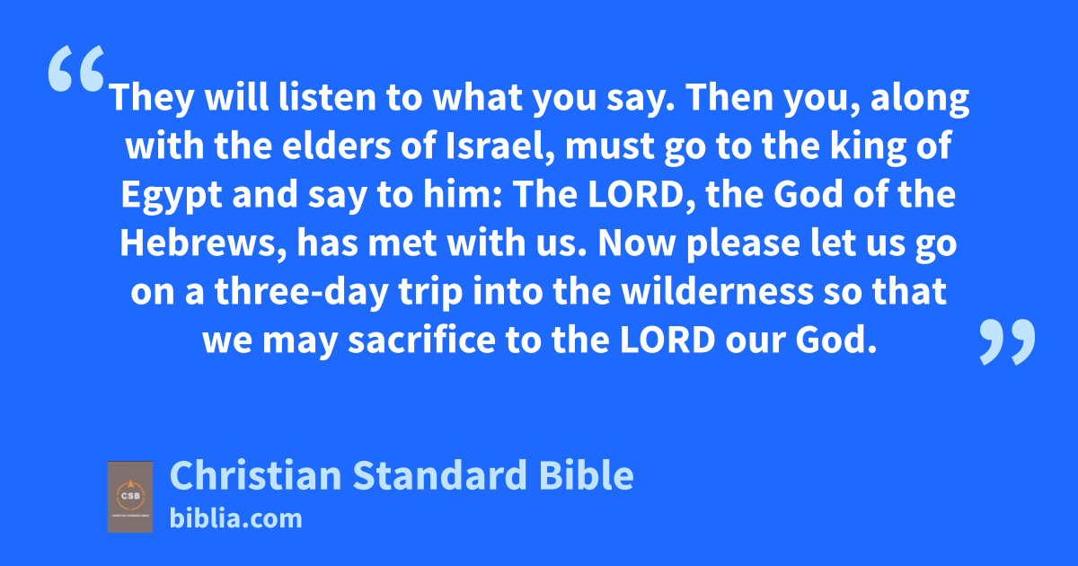 16 “Go and assemble the elders of Israel and say to them: The Lord, the God of your ancestors, the God of Abraham, Isaac, and Jacob, has appeared to me and said: I have paid close attention to you and to what has been done to you in Egypt.w 17 And I have promised you that I will bring you up from the misery of Egypta to the land of the Canaanites, Hethites, Amorites, Perizzites, Hivites, and Jebusites—a land flowing with milk and honey. 18 They will listen to what you say. Then you, along with the elders of Israel, must go to the king of Egypt and say to him: The Lord, the God of the Hebrews, has met with us. Now please let us go on a three-day trip into the wilderness so that we may sacrifice to the Lord our God.b