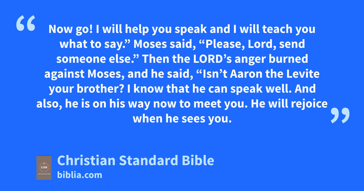 14 Then the Lord’s anger burned against Moses, and he said, “Isn’t Aaron the Levite your brother? I know that he can speak well. And also, he is on his way now to meet you. He will rejoice when he sees you. 15 You will speak with him and tell him what to say.o I will help both you and him to speakA and will teach you both what to do. 16 He will speak to the people for you. He will serve as a mouth for you, and you will serve as God to him. 17 And take this staff in your hand that you will perform the signs with.”p