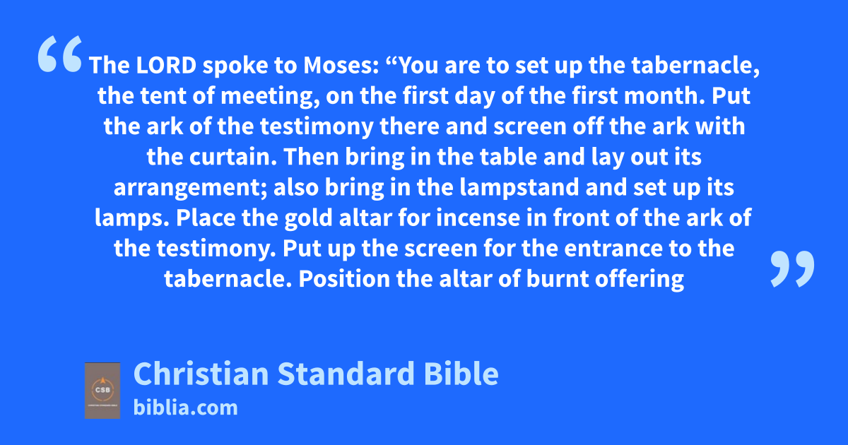 40 The Lord spoke to Moses: 2 “You are to set up the tabernacle, the tent of meeting, on the first day of the first month.B,c 3 Put the arkd of the testimony there and screen off the ark with the curtain. 4 Then bring in the table and lay out its arrangement; also bring in the lampstand and set up its lamps. 5 Place the gold altar for incense in front of the ark of the testimony. Put up the screen for the entrance to the tabernacle. 6 Position the altar of burnt offering in front of the entrance to the tabernacle, the tent of meeting. 7 Place the basine between the tent of meeting and the altar, and put water in it. 8 Assemble the surrounding courtyard and hang the screen for the gate of the courtyard.