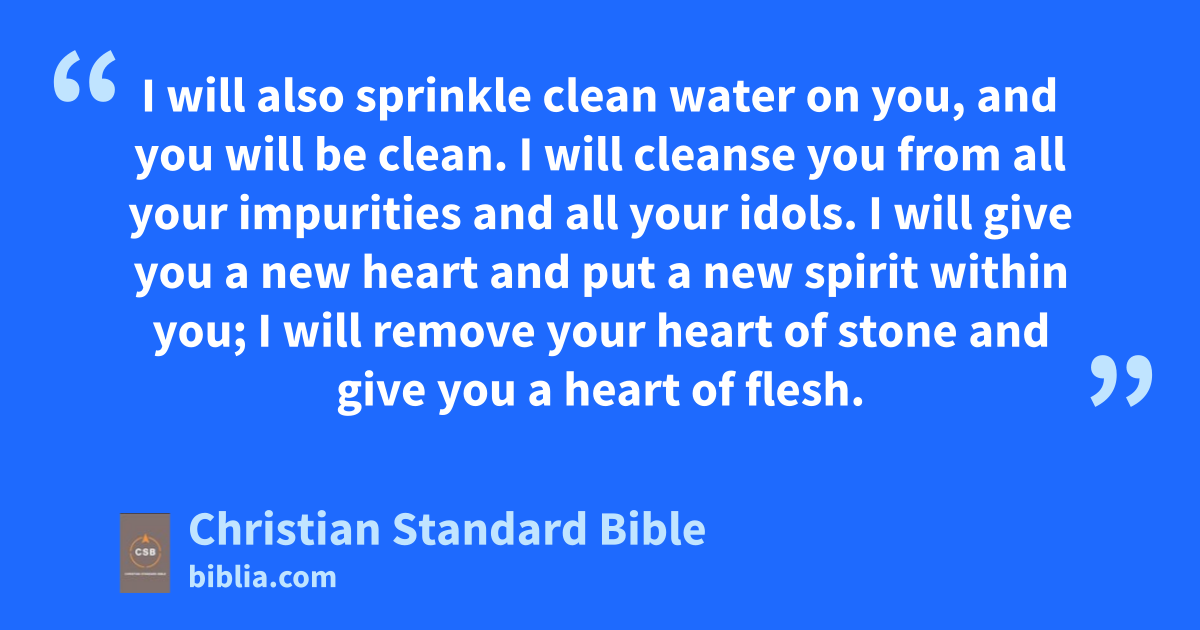 24 “ ‘For I will take you from the nations and gather you from all the countries, and will bring you into your own land.q 25 I will also sprinkle clean water on you, and you will be clean.r I will cleanse you from all your impurities and all your idols.s 26 I will give you a new heart and put a new spirit within you;t I will remove your heart of stoneC and give you a heart of flesh.u 27 I will place my Spirit within youv and cause you to follow my statutes and carefully observe my ordinances.w 28 You will live in the land that I gave your ancestors;x you will be my people, and I will be your God.y 29 I will save you from all your uncleanness. I will summon the grain and make it plentiful, and I will not bring famine on you.z 30 I will also make the fruit of the trees and the produce of the field plentiful, so that you will no longer experience reproach among the nations on account of famine.