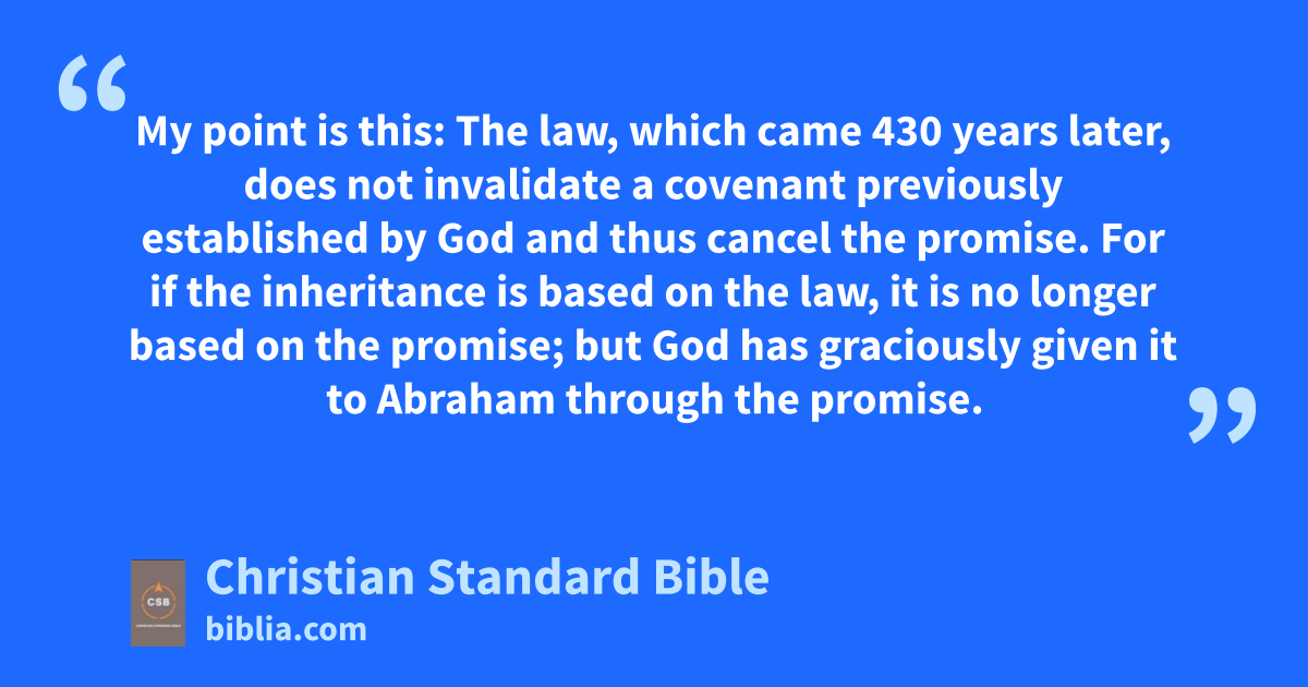 15 Brothers and sisters, I’m using a human illustration. No one sets aside or makes additions to a validated human will.O 16 Now the promises were spoken to Abraham and to his seed. He does not say “and to seeds,” as though referring to many, but referring to one, and to your seed,P,at who is Christ. 17 My point is this: The law, which came 430 years later,au does not invalidate a covenant previously established by GodQ and thus cancel the promise. 18 For if the inheritance is based on the law, it is no longer based on the promise; but God has graciously given it to Abraham through the promise.