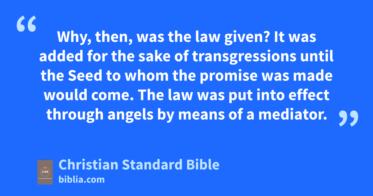 19 Why, then, was the law given?a It was added for the sake of transgressionsA until the Seed to whom the promise was made would come. The law was put into effect through angelsb by means of a mediator.c 20 Now a mediator is not just for one person alone, but God is one.d 21 Is the law therefore contrary to God’s promises? Absolutely not! For if the law had been granted with the ability to give life, then righteousness would certainly be on the basis of the law. 22 But the Scripture imprisoned everything under sin’s power,B,e so that the promise might be given on the basis of faithf in Jesus Christ to those who believe.g 23 Before this faithh came, we were confined under the law, imprisoned until the coming faith was revealed.i 24 The law, then, was our guardian until Christ,j so that we could be justified by faith. 25 But since that faithk has come, we are no longer under a guardian, 26 for through faith you are all sons of God in Christ Jesus.