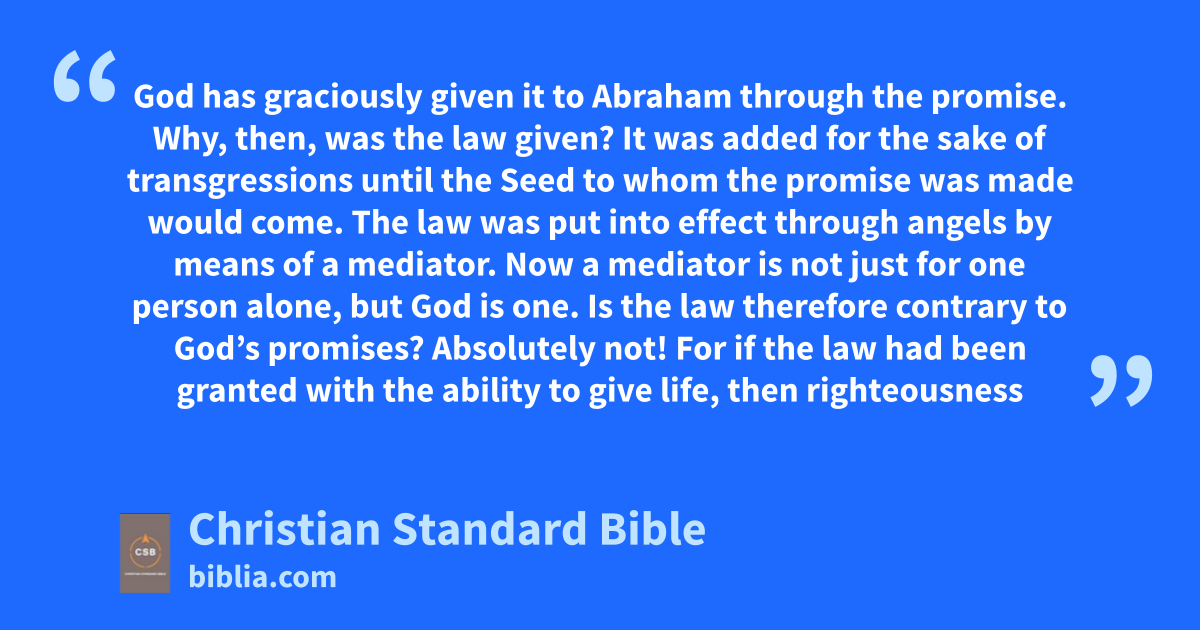 19 Why, then, was the law given?a It was added for the sake of transgressionsA until the Seed to whom the promise was made would come. The law was put into effect through angelsb by means of a mediator.c 20 Now a mediator is not just for one person alone, but God is one.d 21 Is the law therefore contrary to God’s promises? Absolutely not! For if the law had been granted with the ability to give life, then righteousness would certainly be on the basis of the law. 22 But the Scripture imprisoned everything under sin’s power,B,e so that the promise might be given on the basis of faithf in Jesus Christ to those who believe.g 23 Before this faithh came, we were confined under the law, imprisoned until the coming faith was revealed.i 24 The law, then, was our guardian until Christ,j so that we could be justified by faith. 25 But since that faithk has come, we are no longer under a guardian, 26 for through faith you are all sons of God in Christ Jesus.