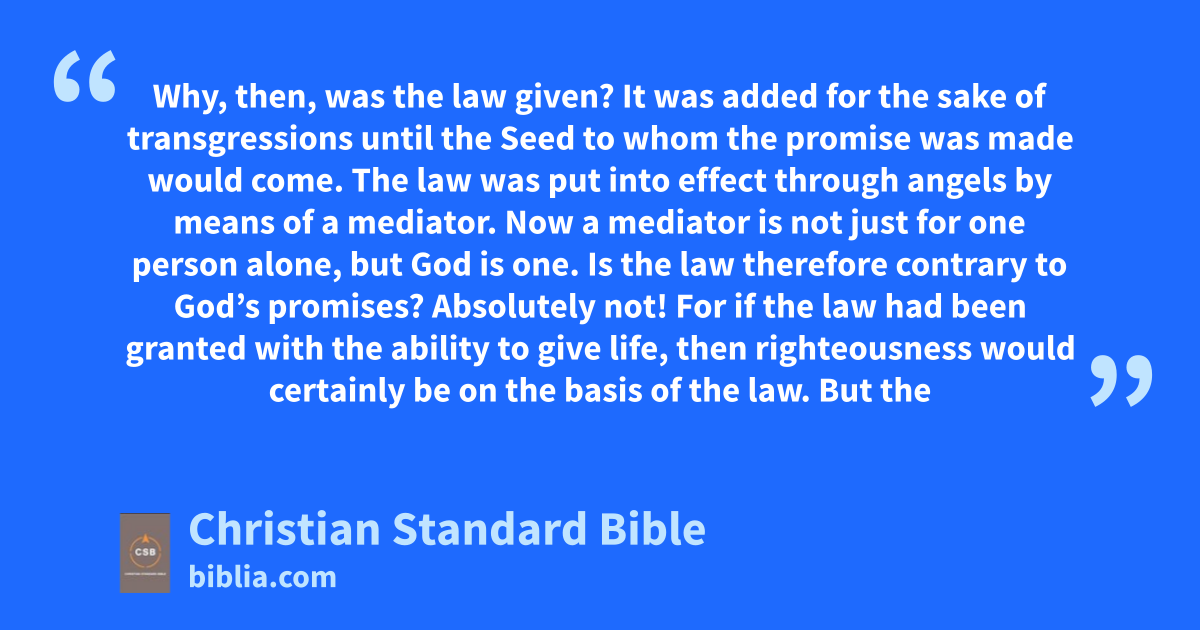 19 Why, then, was the law given?a It was added for the sake of transgressionsA until the Seed to whom the promise was made would come. The law was put into effect through angelsb by means of a mediator.c 20 Now a mediator is not just for one person alone, but God is one.d 21 Is the law therefore contrary to God’s promises? Absolutely not! For if the law had been granted with the ability to give life, then righteousness would certainly be on the basis of the law. 22 But the Scripture imprisoned everything under sin’s power,B,e so that the promise might be given on the basis of faithf in Jesus Christ to those who believe.g 23 Before this faithh came, we were confined under the law, imprisoned until the coming faith was revealed.i 24 The law, then, was our guardian until Christ,j so that we could be justified by faith. 25 But since that faithk has come, we are no longer under a guardian, 26 for through faith you are all sons of God in Christ Jesus.