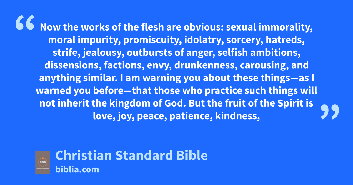 19 Now the works of the flesh are obvious:D sexual immorality,z moral impurity,aa promiscuity,ab 20 idolatry,ac sorcery,ad hatreds,ae strife,af jealousy,ag outbursts of anger,ah selfish ambitions,ai dissensions,aj factions,ak 21 envy,E,al drunkenness, carousing,am and anything similar. I am warning you about these things—as I warned you before—that those who practice such things will not inherit the kingdom of God.an