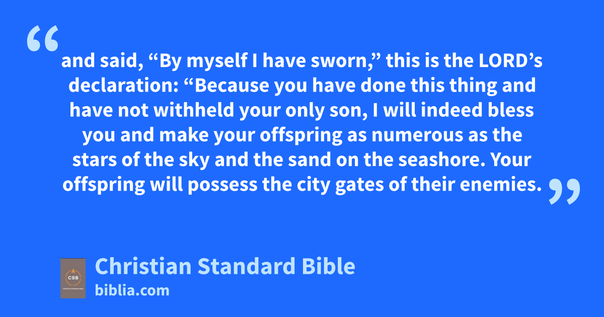 15 Then the angel of the Lord called to Abraham a second time from heaven 16 and said, “By myself I have sworn,”c this is the Lord’s declaration: “Because you have done this thing and have not withheld your only son, 17 I will indeed bless youd and make your offspring as numerous as the stars of the skye and the sand on the seashore.f Your offspring will possess the city gates of theirF enemies.g 18 And all the nations of the earth will be blessedG by your offspringh because you have obeyed my command.”